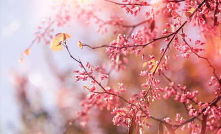 Branches with fresh pink flowers in the morning sunlight against the blue sky. With copy space.