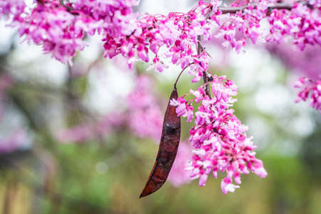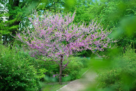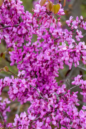 American Eastern Redbud Tree or Cercis canadensis blossoming in a park close up. Selective focus. Nature concept