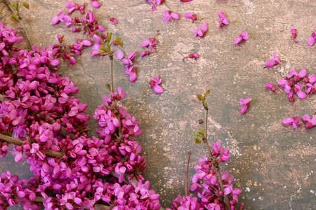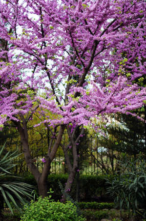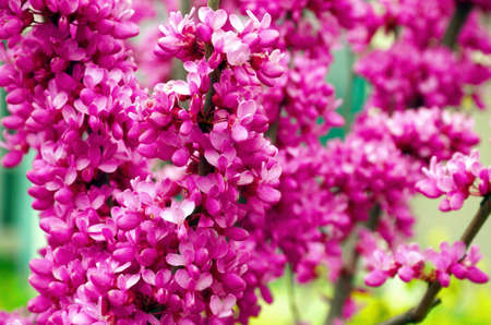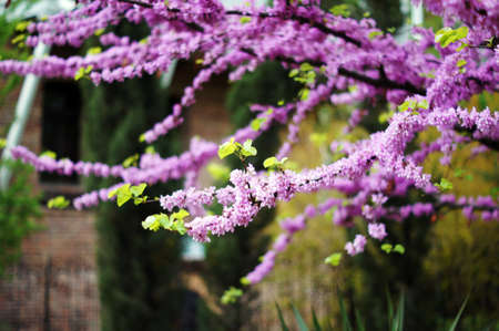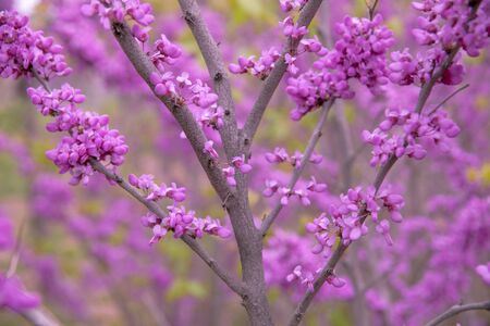 judas tree in blossom. purple flowers on the twigs. beautiful redbud background.