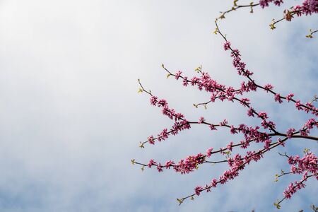 Branches of a blossoming pink-flowered Cercis tree on a background of blue sky with clouds.