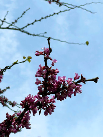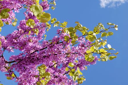 Springtime. Flowers and leaves of redbud tree ( Cercis ) against blue sky