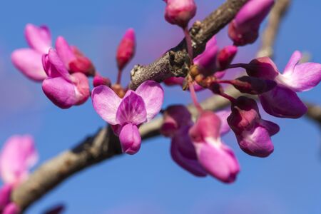 Eastern Redbud tree vivid pink blossoms in spring. The flowers grow on the bark and branches, closeup view.