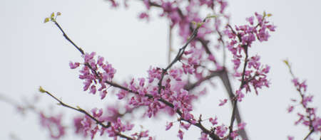 Panorama closeup of Eastern Redbud flowers in bloom on a branch, selected focus