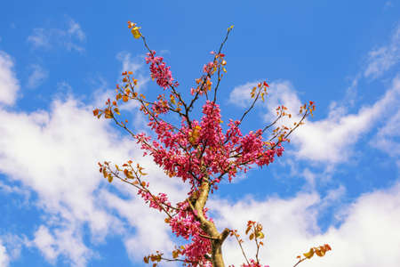 Springtime. Ornamental tree with bright pink flowers against sky on sunny spring day . Cercis siliquastrum tree ( Judas tree )