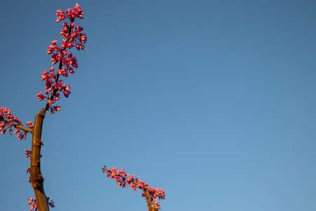 Thin branches of blossoming cercis canadensis against blue sky in mid May