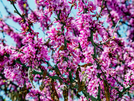 Closeup of pink flower clusters of an Eastern Redbud tree in full bloom. Judas tree or Cercis siliquastrum in spring.