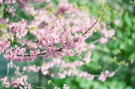 Cercis pink flowers bloom on branches bringing color and beauty to the spring garden. Sunlight filters through the leaves enhancing the scene.