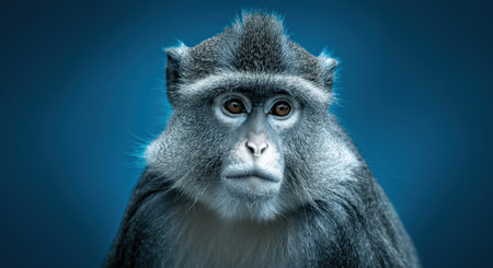 Intense gaze of a blue monkey on blue background for wildlife conservation awareness