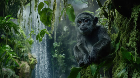 A charming young monkey perched amidst lush foliage in a vibrant jungle, with a stunning waterfall cascading in the background, showcasing rich biodiversity.