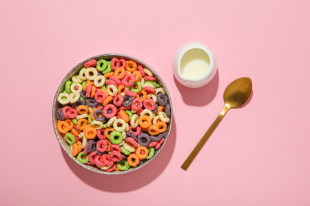 Cereal rings in milk are displayed in a white bowl with a blue spoon against a pink backdrop creating a vibrant and playful image perfect for breakfast advertisements or illustrating childhood memori
