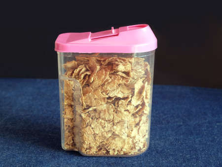 Brown corn flakes in transparent plastic container with pink cap on black background on kitchen table covered jeans tablecloth close-up view