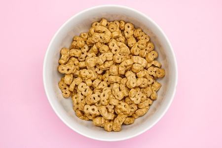 Overhead view of colorful ring shaped breakfast cereal on pink background with copy space. unaltered, breakfast, snack and food concept.