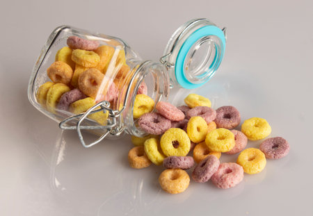 Delicious and nutritious fruit cereal loops multicolored flavorful on white background, healthy and funny addition to kids breakfast