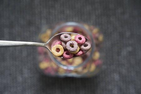 Coloful Cereal breakfast rings Loops in a Bowl with spoon