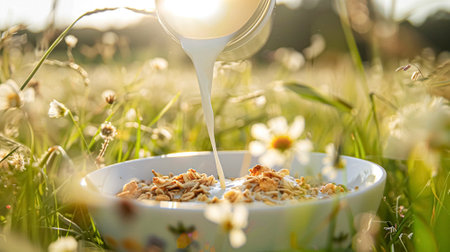 Pouring fresh milk into bowl of cereal in the English countryside field on a sunny morning for breakfast