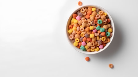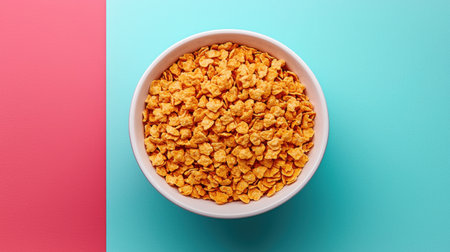 Cereal flakes in bowl with copy space,Breakfast concept.Food with delicious fruity taste and fruity colours.It's made with maize,wheat,and barley