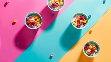 Colored breakfast cereal in a bowl on a colored background, flat lay.
