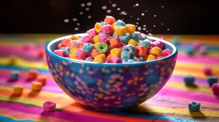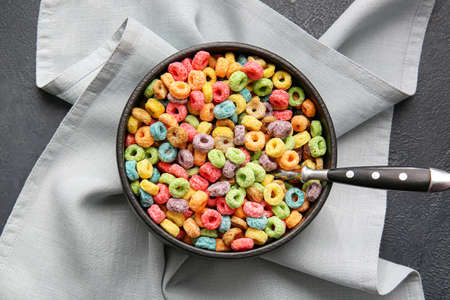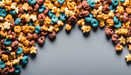 A close-up image of colorful cereal scattered on a gray background, creating a vibrant and appetizing scene.