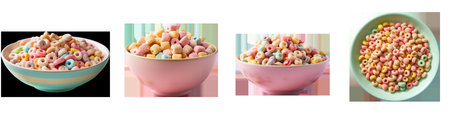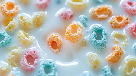 A close-up of floating cereal shapes in milk, with bright colors creating a cheerful vibe.