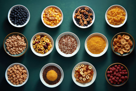 Selection of Healthy Breakfast Cereals In White Bowls With No People