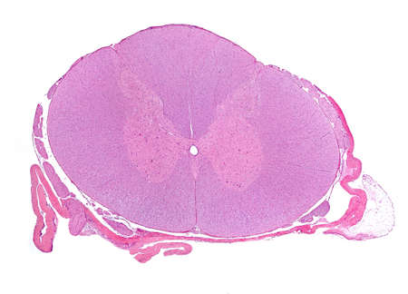 Cross section of the spinal cord. The grey matter (with shape of butterfly wings) is located in the center, surrounded by the white matter. Light microscope micrograph. Hematoxylin & eosin stain.