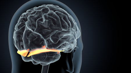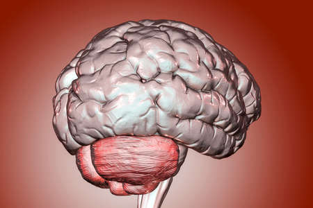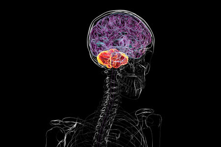 Human brain with highlighted cerebellum, 3D illustration. Cerebellum is responsible for coordination, balance, and fine motor control. Damaged in ataxia and neurodegenerative disorders.