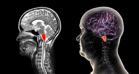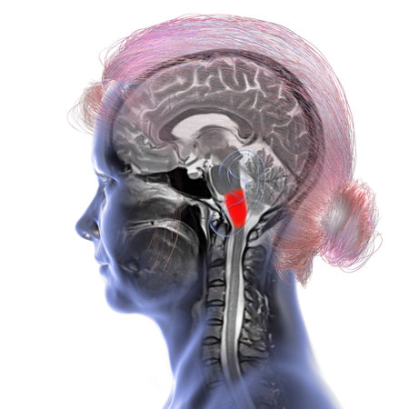 Medulla oblongata highlighted in human brain, colored MRI composite image and 3D illustration. Controls breathing, heartbeat, and other vital autonomic functions.