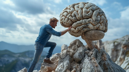 Side view of mature man looking at giant brain on top of mountain