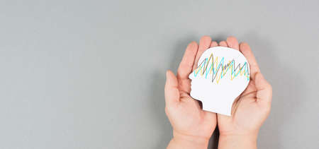 Holding a head in the hands, epilepsy disorder awareness, brain waves, mental health care, paper cut out
