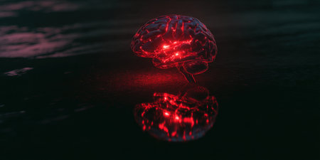 Human brain rendering glowing red with illuminated areas reflecting on a dark, wet surface, symbolizing concepts of mind, intelligence, artificial intelligence, and neuroscience research