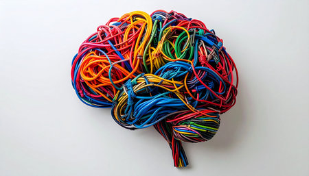 A vibrant representation of the human mind, where a complex network of colorful wires forms the shape of a brain.