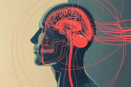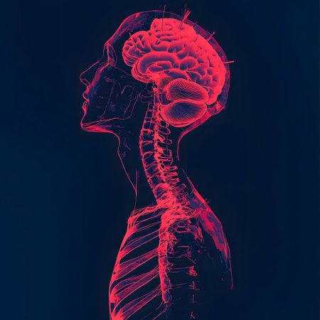 Striking scientific illustration of a human brain and spinal cord network highlighted in vivid red on dark blue