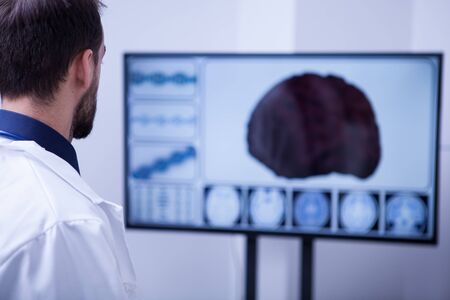 Young male surgeon using technology to check out a patient brain. Brain on the screen.