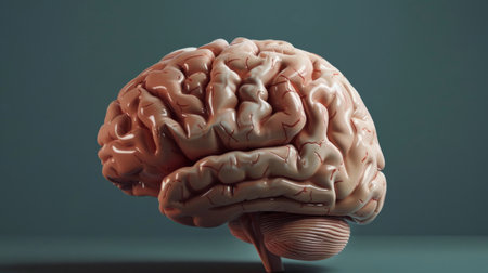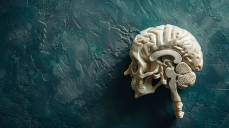 A detailed anatomical model of a human brain and skull rests on a textured teal surface. The model is positioned in profile, showcasing the intricate structure of the brain and the bony framework of the skull.