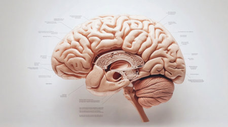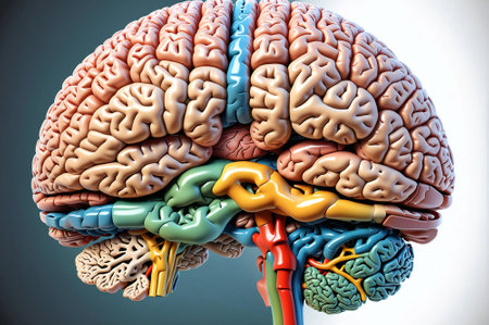 A model of the human brain, showing the different lobes and sections, with labels or color coding for an educational look, isolated on a clean background.