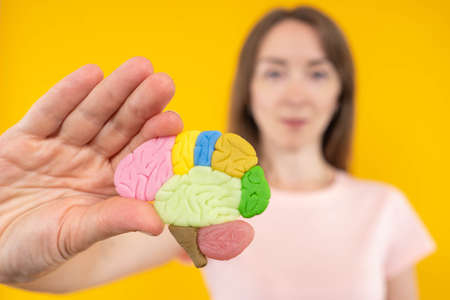 Brain, thinking, mental activity. Brain mock-up in human hands. A woman holds a model of a human brain in the palm of her hand. Mental abilities. Mental health. Health care.