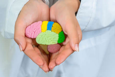 Prevention of dementia. Mental health. Doctor holds brain mock-up in her hands. Doctor takes care of the patient brain condition. Alzheimer disease, Parkinson disease, dementia, stroke, mental health