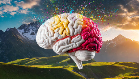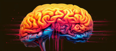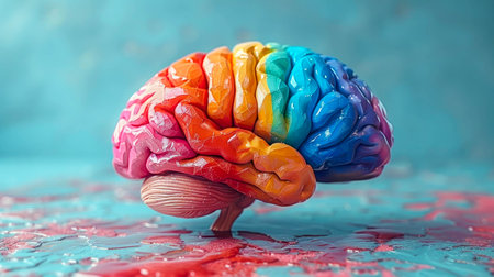 A colorful brain with a rainbow of hues, appearing wet and dripping with water droplets.