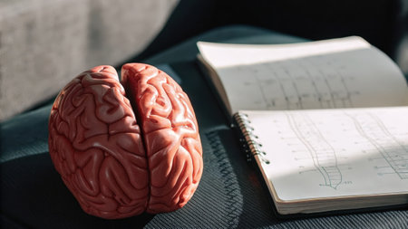A closeup view of a brain model and a notebook filled with brainstorming ideas illustrating the intersection of neuroscience and microdosing as tools for improving cognitive.