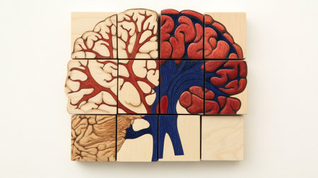 Wooden puzzle representing a human brain with red and blue arteries and veins, assembled on a neutral background. Perfect for visuals related to health, anatomy, or neuroscience