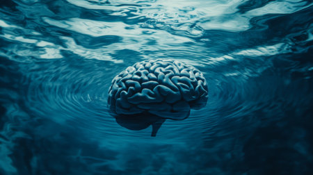 A serene image of a human brain floating in a clear blue water environment, surrounded by gentle ripples, symbolizing peace and contemplation.