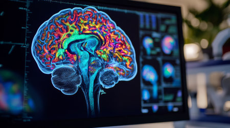 A high-resolution image of a human brain scan on a computer screen, showing detailed MRI or CT images with vibrant colors highlighting different brain areas