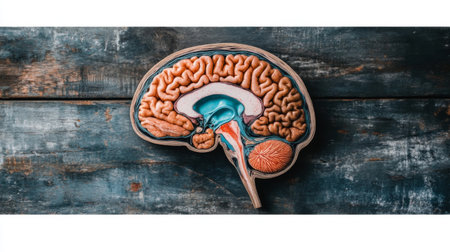 This image showcases a detailed model of the human brain, highlighting its unique anatomy. The brain model is displayed on a rustic wooden surface, ideal for educational and scientific use.