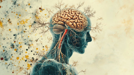 This striking illustration features a human brain with intricate neurons and blood vessels emanating from the side profile, symbolizing thought and consciousness.