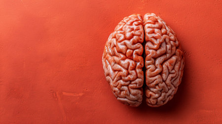 Human brain on a red background. Top view. Copy space.