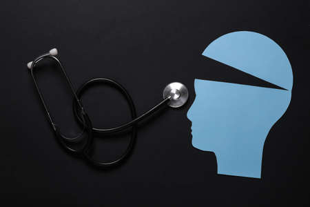 Open your mind, mental health concept, creative thinking. Paper silhouette of human head and stethoscope on black background