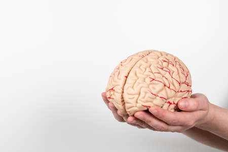 Brain model in a womans hands on a white background. Copy space