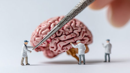 A team of surgeons in scrubs and masks carefully performs a complex brain surgery, focusing intently on the intricately detailed brain placed on the sterile table under bright lights.
