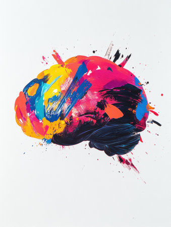 A brain is vividly adorned with bright paint strokes and splashes, symbolizing creativity and artistic expression in modern art.
