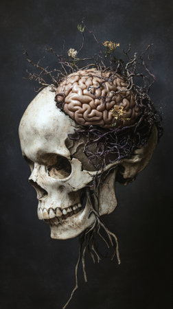 Skull with exposed brain and growth of roots and flowers